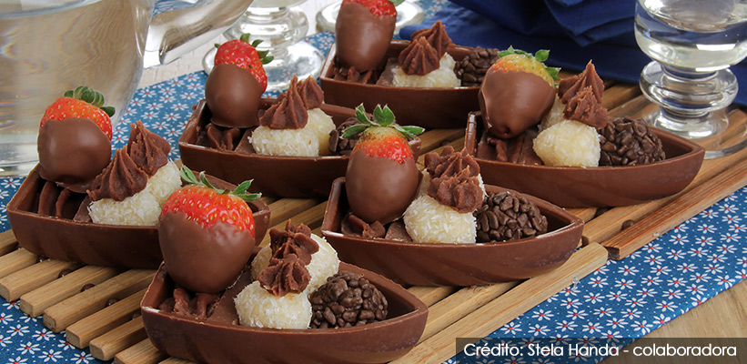Derreta o chocolate ao leite em banho-maria e pincele em 12 forminhas de acetato com divisória para mini barca. Vire de cabeça para baixo para escorrer o excesso. Leve à geladeira por 10 minutos. Repita o procedimento por mais 3 vezes. Para o brigadeiro, em uma panela leve ao fogo médio o leite condensado, a manteiga, o chocolate picado e o chocolate em pó, mexendo até levantar fervura e desgrudar do fundo da panela. Separe 1/3 do brigadeiro e misture o creme de leite nesta parte. Coloque o restante em um prato e deixe esfriar. Para o beijinho, em uma panela leve ao fogo médio o leite condensado, a manteiga e o coco, mexendo até soltar do fundo da panela. Transfira para um prato e deixe esfriar. Com as mãos untadas com margarina modele bolinhas pequenas com o beijinho e passe pelo coco ralado. Reserve. Faça o mesmo com o brigadeiro sem o creme de leite, passando pelo granulado. Coloque o brigadeiro com creme de leite em um saco de confeiteiro com bico pitanga pequeno. Desenforme as barquinhas com cuidado. Em cada uma coloque 2 beijinhos e um brigadeiro na parte maior. Decore os beijinhos com um pouco do brigadeiro do saco de confeiteiro. Preencha a cavidade menor também com esse brigadeiro e coloque um morango. Sirva em seguida.